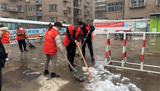 昨晚,鄭州市迎來了牛年第一場雪,小區(qū)活動場地已披上一層皚皚白雪,為方便小區(qū)居民通行,志愿者們拿著鐵鍬、掃把清理廣場上的積雪,經過大家的努力,積雪被清理干凈。